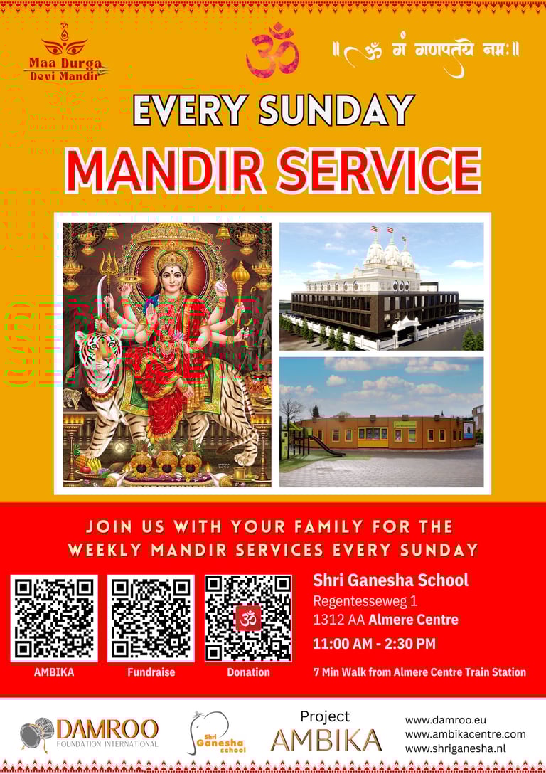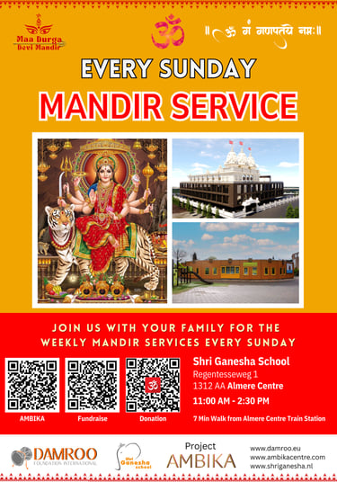 We are thrilled to present Project AMBIKA, an ambitious initiative to create a vibrant spiritual, cultural, and commercial landmark in the heart of Almere Poort. With construction scheduled to commence in 2026-2027, this project will culminate in the opening of the AMBIKA Centre, a unique, multi-purpose building designed to serve the entire community and to house the Maa Durga Devi Mandir.