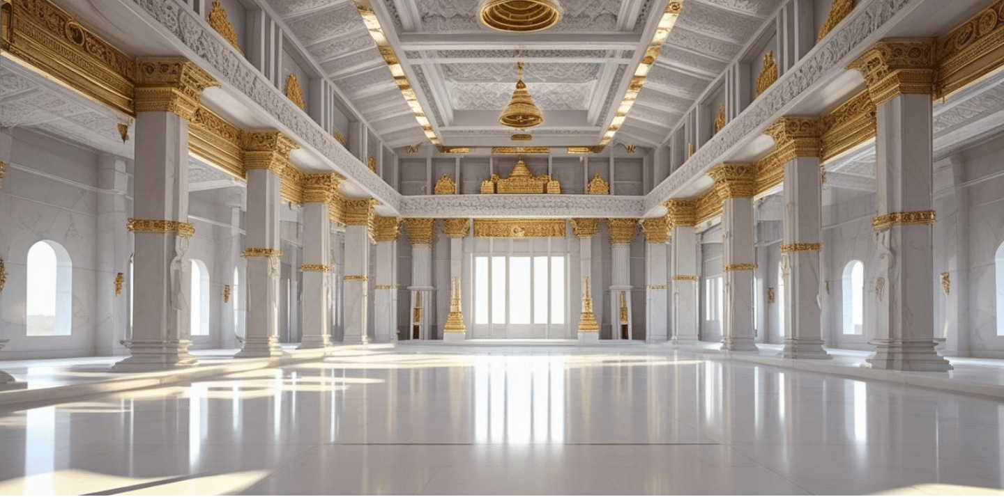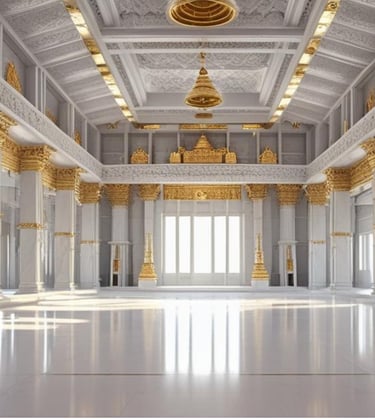 A serene main temple hall with multiple double doors to allow for natural air circulation and expansion for larger gatherings.